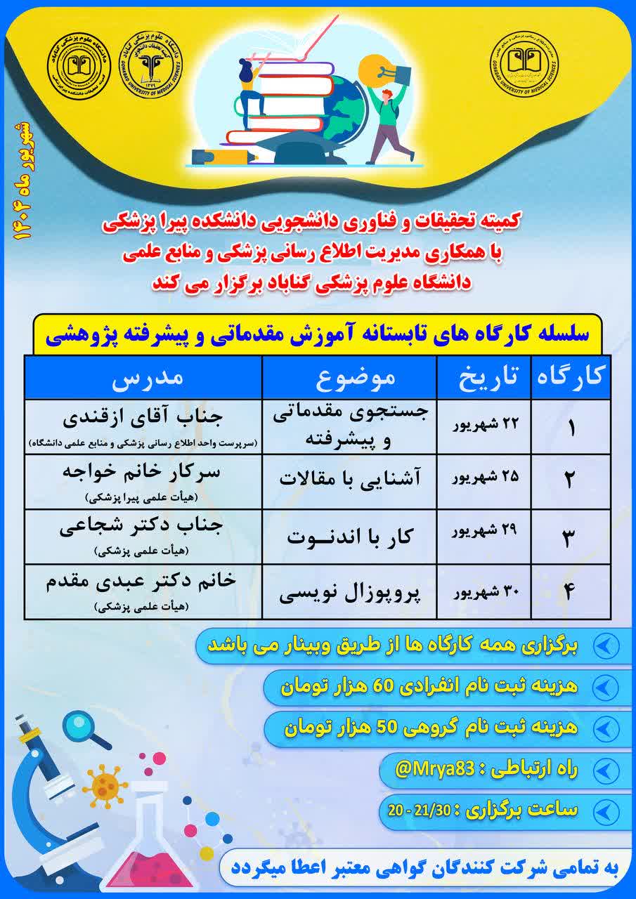 کمیته مدیریت اطلاع رسانی پزشکی و منابع علمی با همکاری کمیته تحقیقات و فناوری دانشجویی دانشکده پزشکی و انجمن علمی علوم آزمایشگاهی کارگاه آشنایی با خدمات جستجو و بانکهای اطلاعاتی را در تاریخ 22 شهریور ماه 1404 از ساعت 12 الی 20 به صورت وبینار در محیط اسکای روم برگزار گردید.